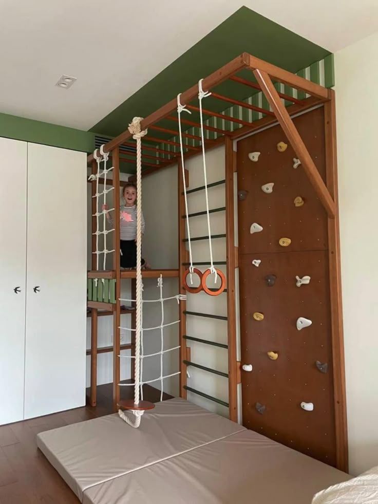 Turn your child’s room into a dynamic indoor adventure zone with the Custom Indoor Monkey bar Gym. Thoughtfully handcrafted from high-quality solid wood, this multifunctional play structure combines the joy of movement with the benefits of healthy physical development. Whether it’s climbing, swinging, balancing, or just burning off energy indoors – this setup transforms any space into a safe and engaging kids’ home gym.