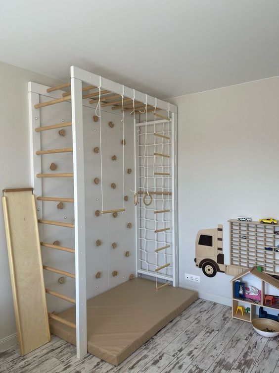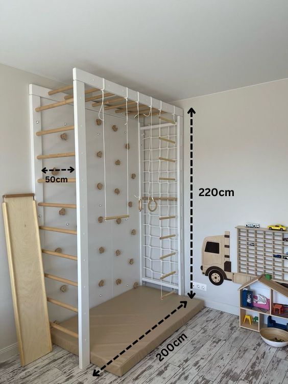 Create a fun and functional active play zone right in your child’s room with this modern, space-saving indoor climbing gym. Thoughtfully designed with Montessori principles, this multi-functional wall unit helps children build strength, coordination, balance, and confidence—all through purposeful play.