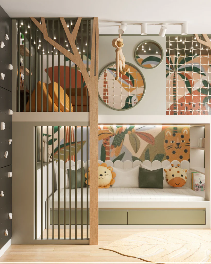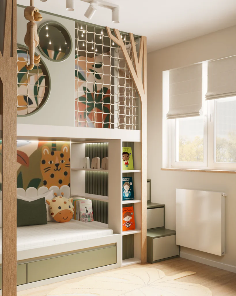 Treehouse-Themed Design: Sparks creativity and encourages imaginative play while giving the room a stylish and playful vibe.