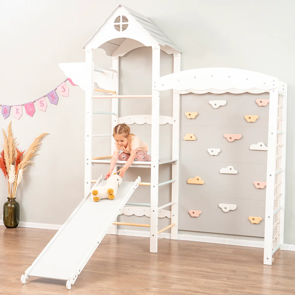 This Montessori Play Gym Tower with Slide is ideal for ages 2+ and is the perfect balance of fun, safety, and learning.