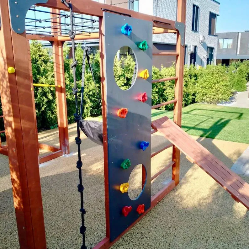 Multi-Activity Play Zone – Includes a climbing wall, monkey bars, rope climb, swing, slide, and basketball hoop.