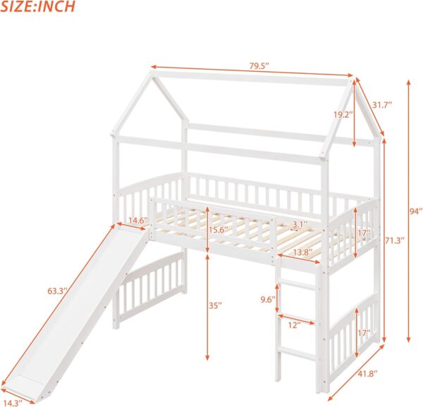 This loft-style kids bed features a sturdy solid wood frame, playful roof structure, full-length safety rails, and a smooth-slide exit for added fun. Whether it’s used for sleep, quiet reading, or daily adventures, this bed turns bedtime into something kids actually look forward to.